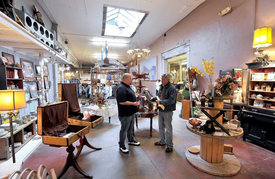 Steve Roe, Beacon of Hope executive director, right, looks over a vintage coffee urn at the Second Chance thrift store with store manager and Beacon resident Chad Gilstrap, left. This section of the store is newly opened and is part of the building the Beacon purchased at the corner of First Avenue North and 10th Street.