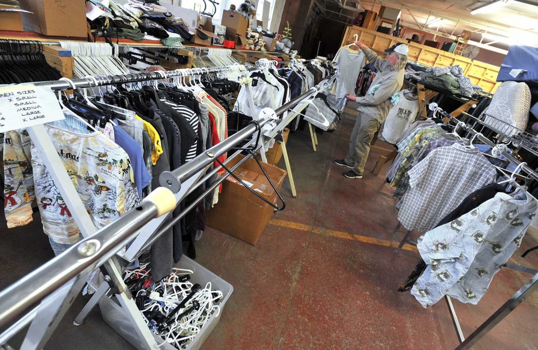 Beacon of Hope resident Dale Gustafson helps sort clothing in the intake area of the Second Chance thrift store.