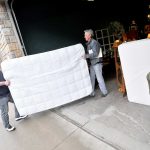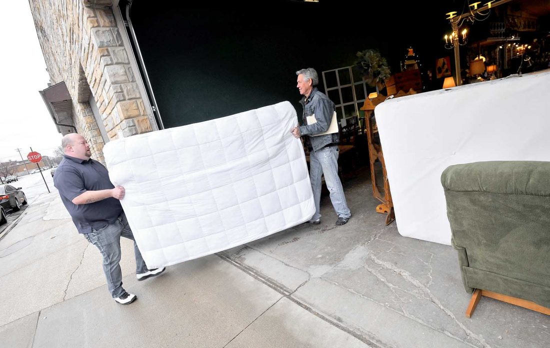 Steve Roe, Beacon of Hope executive director, right, helps Chad Gilstrap, Second Chance thrift store manager and Beacon resident, carry a mattress out of the store.