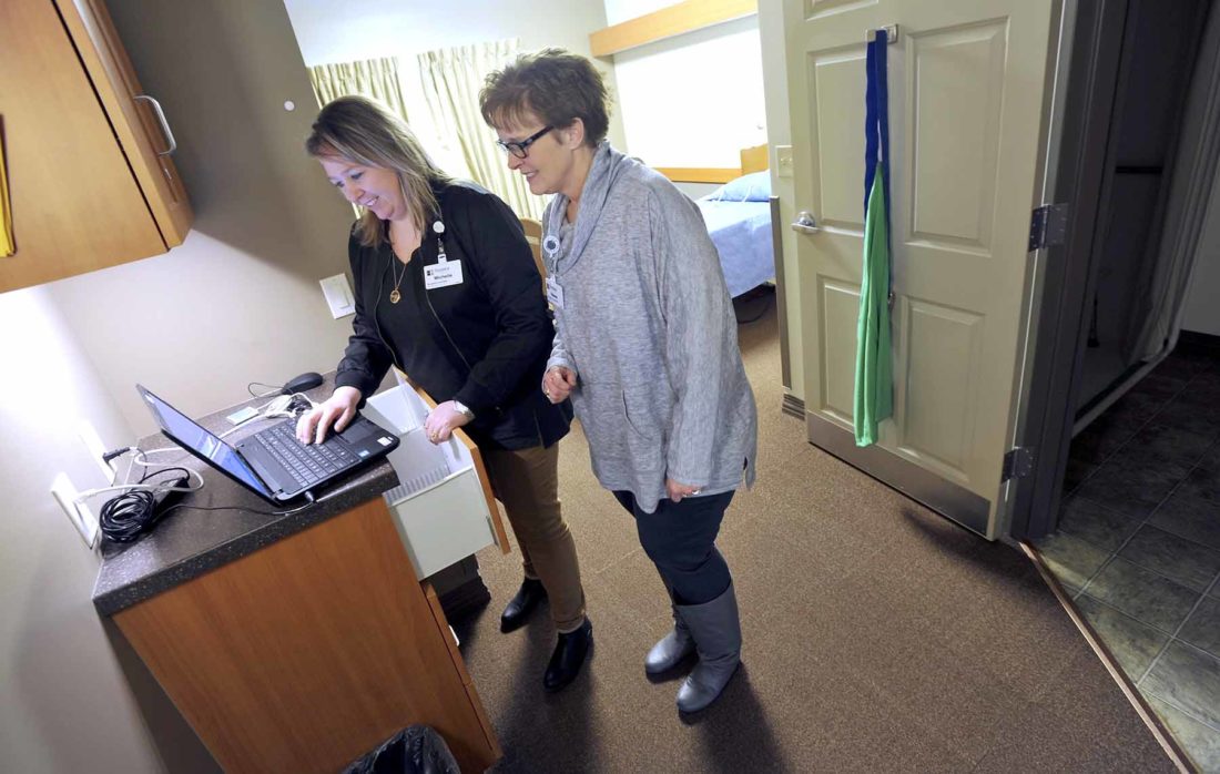 RN Michelle Jakeman, director of clinical quality, and Stacey Poldervaart, director of the Catalyst Center and assistant director of nursing for the Simpson Health Center, look over one of the computer terminals in a resident room in Catalyst Center. The newly remodeled center within Friendship Haven features private rooms and is for residents transitioning to either home or other care.