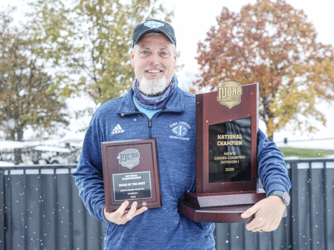 Long-time Iowa Central cross country coach Dee Brown was named the 2025 NJCAA coach of the meet after helping his Triton men capture a sixth national championship on Saturday at Lakeside Golf Course inside Kennedy Park.
