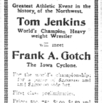 Frank Gotch faced off against World Champion Heavyweight wrestler Tom Jenkins on Jan. 27, 1904. This flyer advertises ringside and box seats for $2.50.