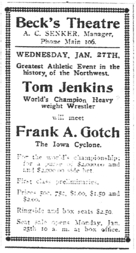 On Jan. 27, 1904, sports fans throughout the nation fixated on a professional wrestling match held in Bellingham, Washington. Gotch, the “Iowa Cyclone” from Humboldt, was confronting “rough” Tom Jenkins, current World’s Champion from Cleveland, Ohio. Though a small northwest town at the time, Bellingham had gained a reputation as an early hotbed of professional wrestling.