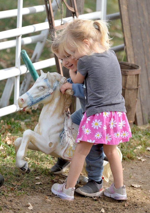 Henry Heatherington, then 3, of Fort Dodge gets a hug from his daycare friend Brinley Ladlie, then 3, of Clare as they enjoy the 19th Annual Pumpkins and Ponies at Springvale Farm near Humboldt.