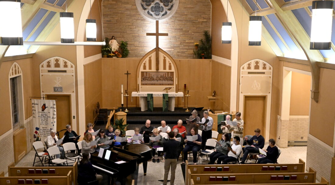 The Fort Dodge Choral Society, under the direction of Jacob Pedersen, rehearses recently at Grace Lutheran Church in Fort Dodge.