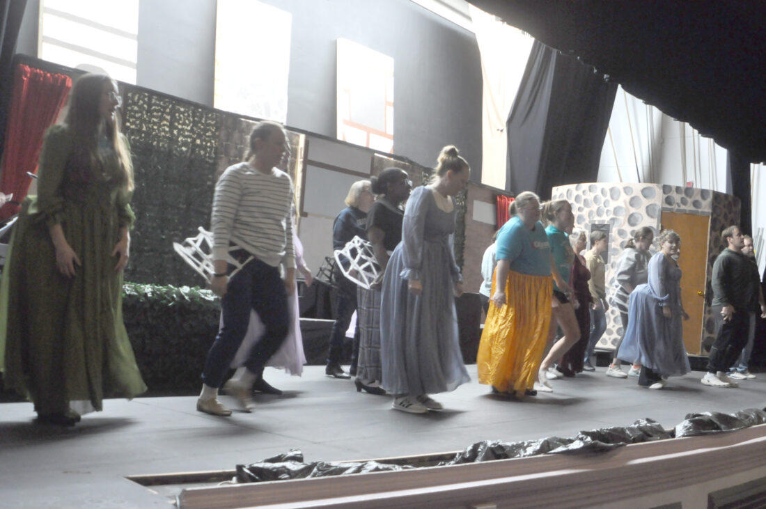 The cast of “Something Rotten!” rehearses on stage at the Historic Phillips Auditorium.