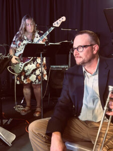 Cheri Schengel-Hennager, bass guitar, and Paul Bloomquist, trombone, perform with the 515 Big Band.