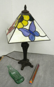 These three pieces represent Jim Mormann’s first venture into the world of stained glass. The lamp shade, melted Coke bottle and kaleidoscope were created during a six-week course Mormann took in the year 2000 in Waverly.