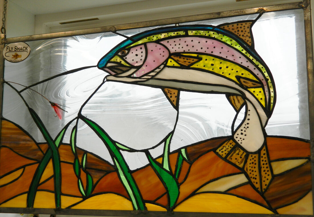 This stained-glass rainbow trout hangs in Jim Mormann’s Manson workshop.