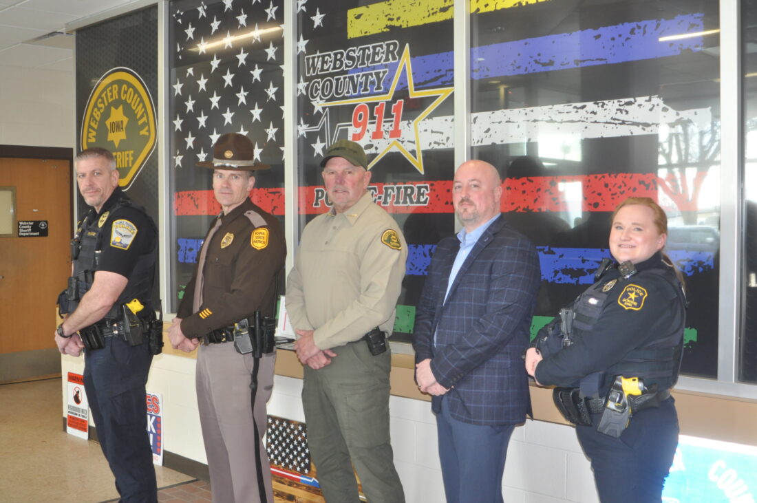 Fort Dodge Police Chief Dennis Quinn, left, Trooper Paul Gardner of the Iowa State Patrol, Webster County Sheriff Luke Fleener, TJ Pingel of Serving Our Servants and Gowrie Police Chief Molly Anderson are preparing for the Thin Blue Line Ball in Fort Dodge this month.