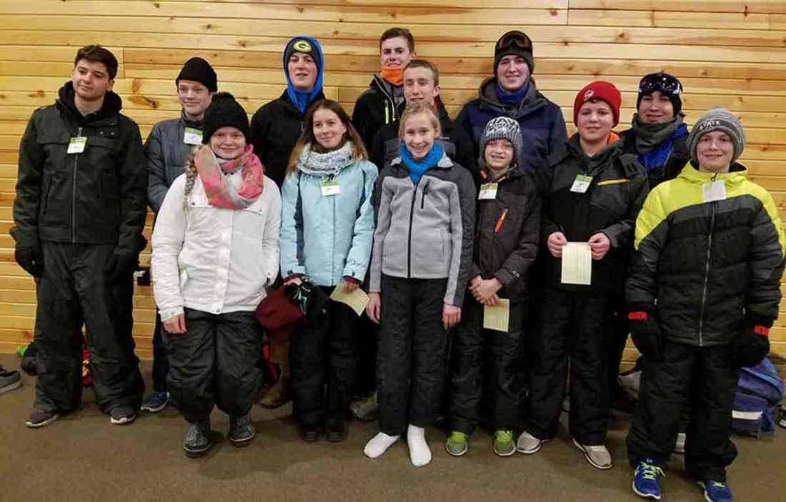 A group of Calhoun, Cherokee and Sac County youths took an adventure to Seven Oaks in Boone to ski and snow tube and then traveled to Clover Woods (formerly known as the 4-H Camp) to spend the evening and also participate in some fun team building activities. Pictured from left in front are: Aleisha Thayer, Reka (foreign exchange student), Carly Tegels, Drew Blum, Grant Movall, and Caden Biede. In the back row are Carlos (foreign exchange student), Logan Blum, Alex Movall, Chase Hurd, Connor Tegels, Connor Pickhinke and Logan Pickhinke.