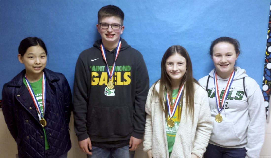 The St. Edmond Middle School Quiz Bowl Team competed at a contest held in Algona recently. This team, which included, from left, Hongah Kim, Luke Royster, Anna Lursen and Ava Andrew, placed first. A total of 14 teams took part in the competition, including three teams from St. Edmond.