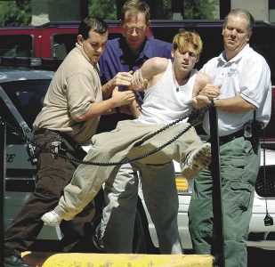 Webster County jailer John Reedy, left, Fort Dodge police officer Joel Lizer, center, and Webster County jailer Steve “Wally” Elifrits, right, arrest Ty Johnson, center after a brief foot chase in downtown Fort Dodge on Ninth Street between Central Avenue and First Avenue South. Johnson had just been sentenced in Associate District Court to two years in prison for attempted third-degree burglary. After his flight and brief chase, he was charged with escape, a serious misdemeanor, and could face another year in prison.