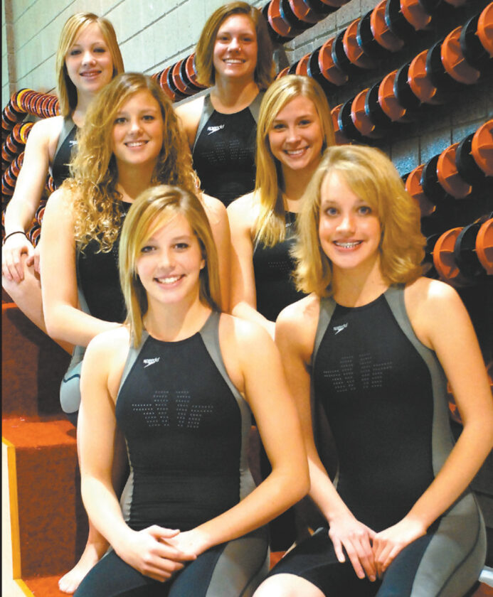 Fort Dodge Girls state swim qualifiers are, front row, left to right: Jaime Pearson and Ellie Savery. Middle: Ali Chambers and Katie Post. Back: Taylor Stanley and Kelsey Bocken.