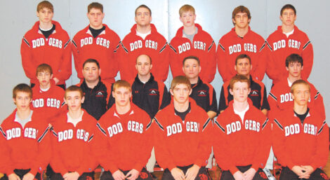 Fort Dodge wrestling team members for 2009 the state dual tournament are, front row, left to right: Monty Arends, Matt Birnbaum, Brandon Stewart, Nate Halverson, Keegan Nelson and Chase Grove. Middle: Reed Russell, assistant Tommy Thompson, assistant Vic Vanderpool, head coach Bobby Thompson, assistant Rod Riessen and Ryan Riessen. Back: Trevor Cook, Sean Springer, Taylor Morrow, David Rogers, Tyler Wingerson and Cody Marsh. Not pictured: Cole Clarken and Keaton Lunn.