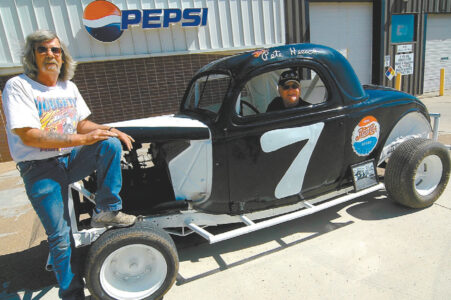 Marty Pringle, left, poses with the V-8 Ford Flathead powered vintage race car he built for Pete Heesch, pictured here in the driver’s seat. The car is a replica of the one Heesch drove in 1955-’58, which he believes was the first in the area to be sponsored by Pepsi. His nickname when he was racing was “Pepsi Pete.” The car work was done by Pringle and Randy Hoover, Nancy Pringle painted the lettering and logos.