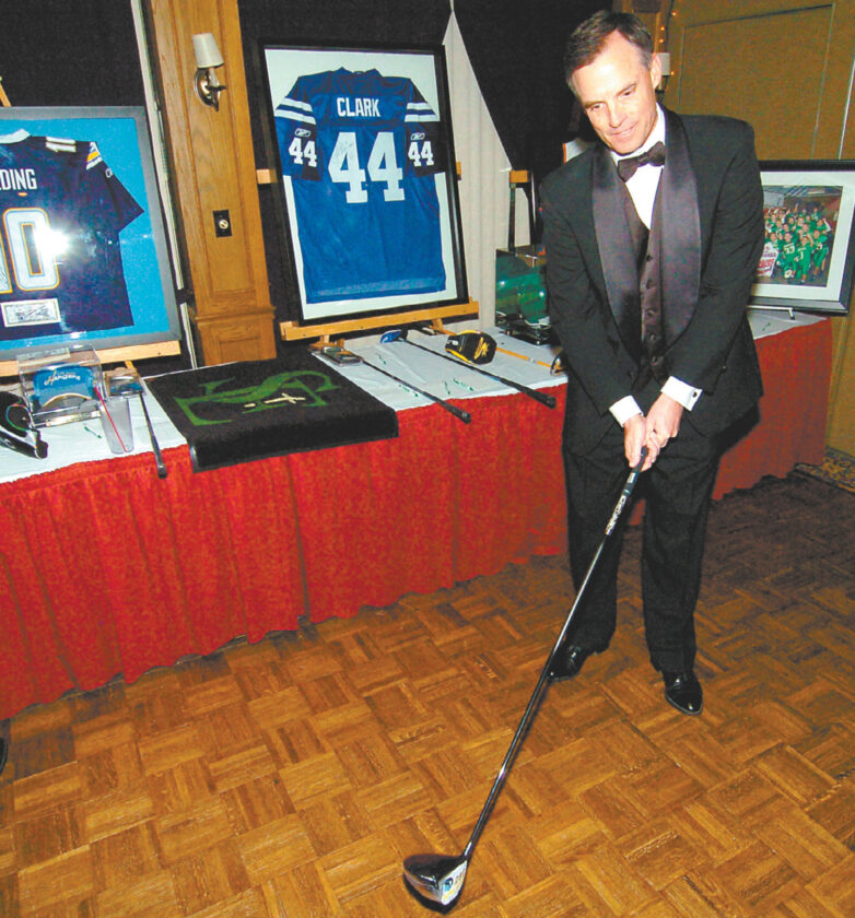 Neven Mulholland tries out one of the golf clubs included in the Friends of St. Edmond Ball at the Best Western Starlite Village. The event featured the auction, dinner and entertainment. Funds raised go toward the continuing operations of the St. Edmond Catholic School System.