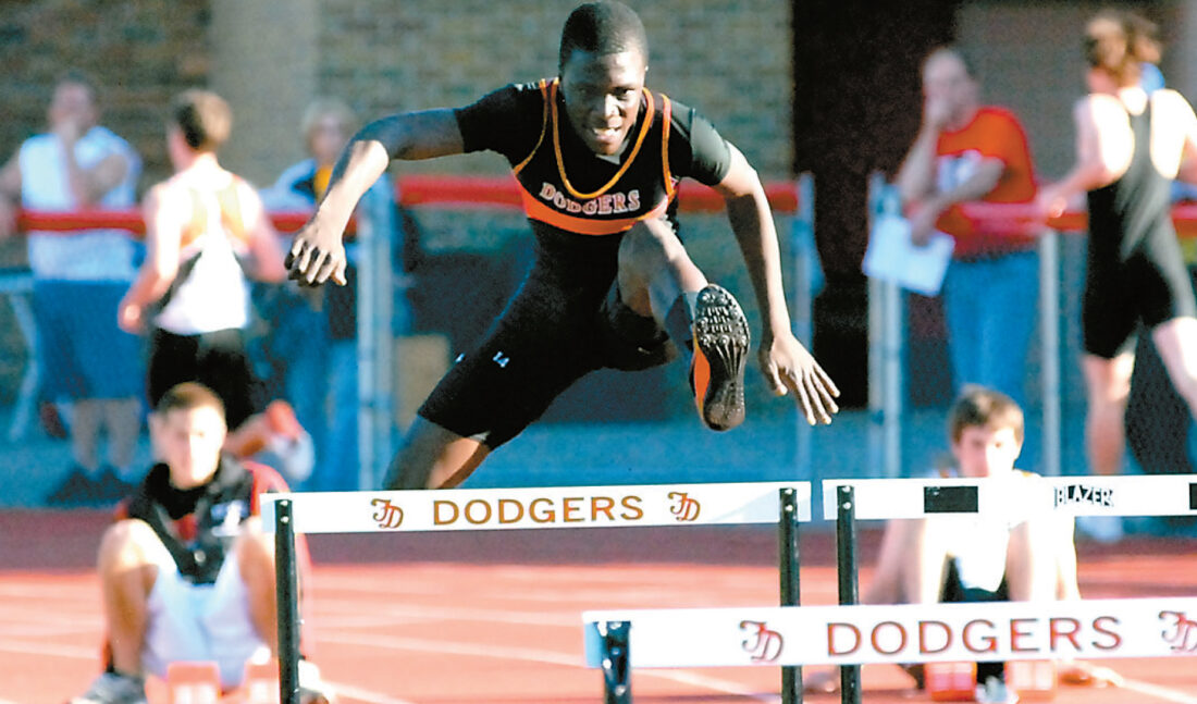 t Dodge’s Willie Williams competes in the shuttle hurdle relay at the Dodger Relays. The Dodgers set a school record in the event with a time of 1:00.51. Williams was joined by Reid Riessen, Connor Brown and Jay Johnson.