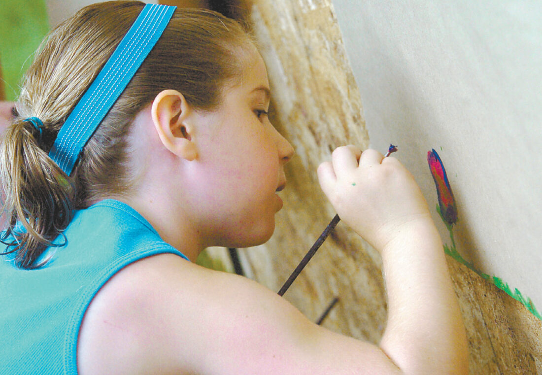 Sally Hiveley, then 7, of Fort Dodge, is a study in concentration as she works on her mural, “A Summer Picture,” during the Blanden Memorial Art Museum’s Kids Art Day. She later added clouds and the sun to her work.