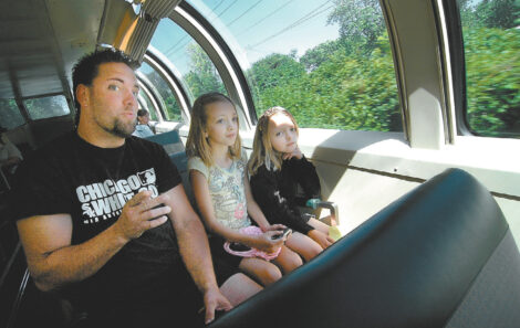 Rick Estlund, left, points ahead to remind his daughters Gabby, then 9, and Lexie, then 8, that they are about to cross the High Bridge over the Des Moines River while riding on the Union Pacific Operation Lifesaver Train. The family enjoyed the view from the Vista Dome observation car “Columbine.” Shortly before going onto the bridge, an excited Estlund told his daughters, “Here’s the bridge. I’m gonna bite my nails off.”