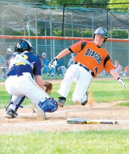 Fort Dodge’s Zach Elsbecker slides into home plate, where Indianola catcher Meredith Meader waits for him. Fort Dodge won 6-0.