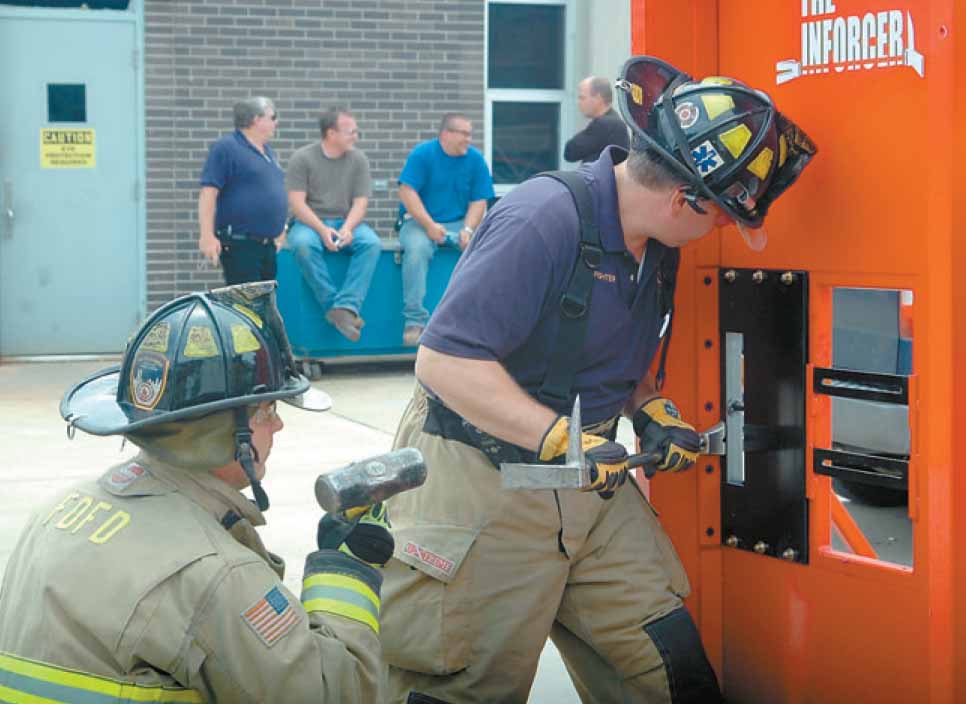 Former Fort Dodge Firefighter John Bittner, right, uses a Halligan tool to pry open The Inforcer training door Monday afternoon at Iowa Central Community College. Former Firefighter Kenny Moen assists in the process. The training tool gives firefighters and law enforcement officers the chance to practice forcible entries on a steel door that can be reset and used over again.
