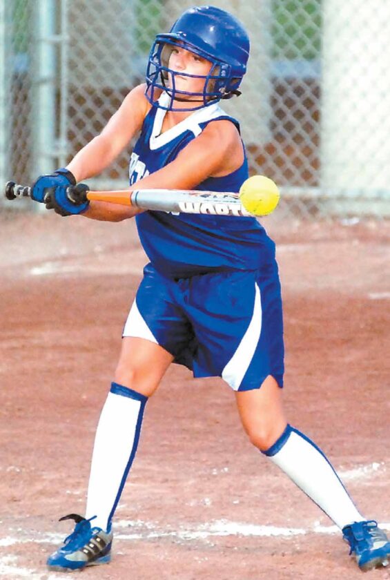 Newell-Fonda’s Susan Kies hits against Martensdale-St. Mary’s in a 1A semifinal at Rogers Park. The defending state champion Mustangs won, 3-2.