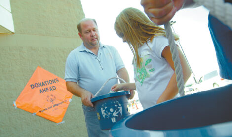 Carly Halligan, then 8, drops a donation into the bucket held by Fort Dodge Correctional Facility Corrections Officer Gary Poldervaart as the Cops on Top campaign gets under way at the Fort Dodge Wal-Mart store. All proceeds from the campaign support Special Olympics Iowa. Security Secretary Paula Addison holds the other bucketful of treats for donors.