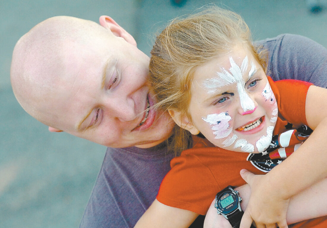 Kirstyn Garretson, then 4, of Fort Dodge, tries to escape from the dreaded dad hug being given by her father, John, as the family attended the annual National Night Out/Back To School Bash in the parking lot of Corpus Christi Catholic Church Tuesday evening.