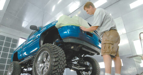 Jamie Ziegler, co-owner of Metal Workz Inc. in Fort Dodge, masks off a section of fender in the shop’s paint booth. Ziegler started the business with Corey Pratt and Terry McDowell at 3381 Fifth Ave. S.