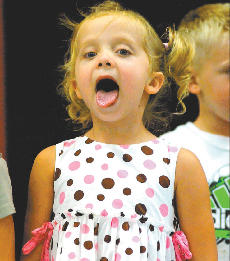 Cooper Elementary School kindergartner Ashlynn Hanson overextends her tongue just a little bit during the singing of the song “Let’s Go See Our Grandparents” during the annual Grandparents Day.