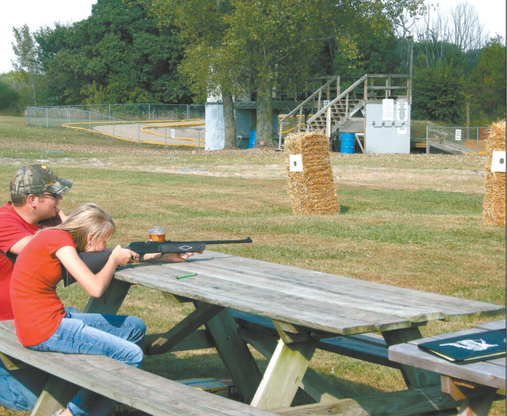 Marissa Anderson, then 13, shoots a pellet gun at the Webster County Pheasants Forever’s 17th annual Fall Family Outing as Chapter Board Member Nick Meyer supervises. Children got $200 “pheasant dollars” at every game they played, more depending on how well they did. They could then use those dollars to bid on toys, pop and other items in a kids auction.