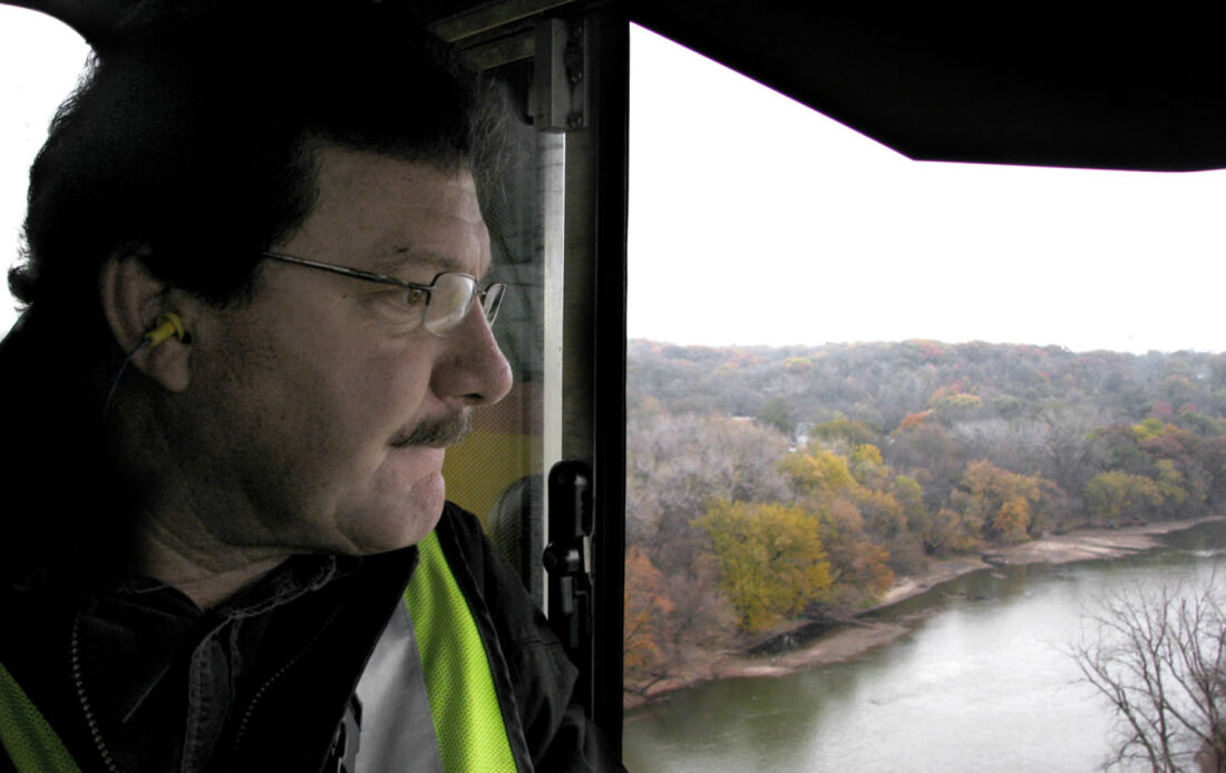 Don Heddinger looks for wildlife as the train he’s conducting passes over the Chicago Great Western High Bridge in Fort Dodge. Heddinger had worked with the Union Pacific Railroad for more than 30 years. He transports ethanol and dried distiller’s grains rather than just corn and soybeans. Heddinger hoped plans for an agriculture industrial park in Fort Dodge would come to fruition, giving him and others on the rail more customers. That ag industrial park is now known as Iowa’s Crossroads of Global Innovation.