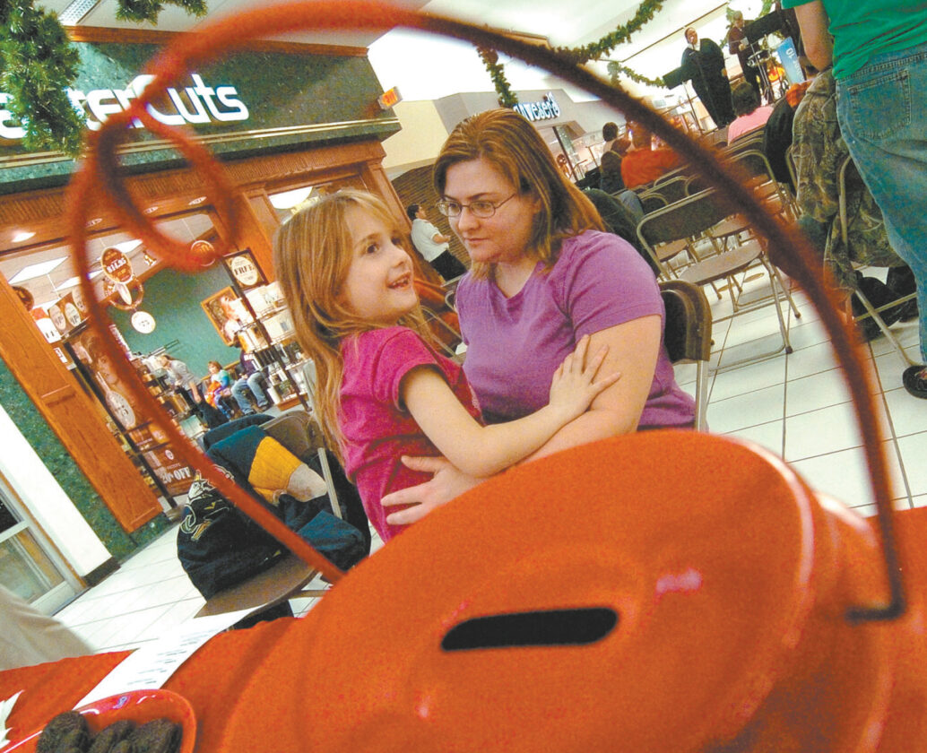 Jerri Evans, then 7, of Fort Dodge, spends a little time with her mom, Barbara, during The Salvation Army 2009 Kettle Kick-Off at the Crossroads Mall.