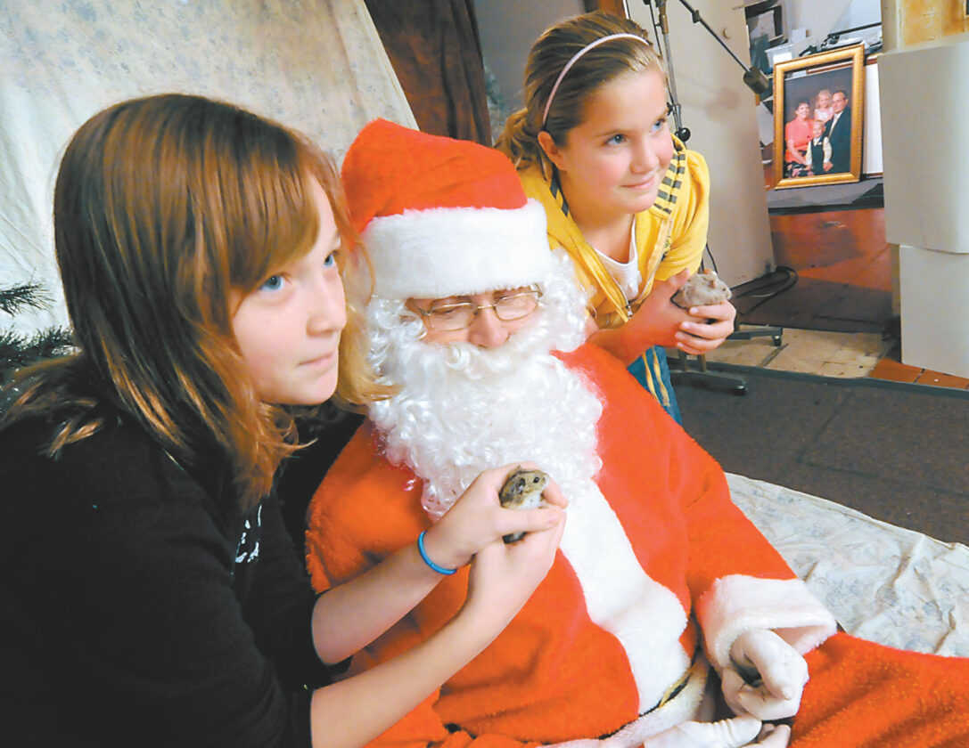 Mackenzie Scacci, then 11, left, holds her dwarf hamster, Lulu, while her friend Aubry Salgren, 11, volunteers to hold her teddy hamster, Lester, for a photo with Santa at Buckroyd Studio during the Humane Society of North Central Iowa Santa Paws fundraiser. Curt Olson, of Fort Dodge, helps out as a stand-in for Santa, who is quite busy this time of the year at the North Pole.