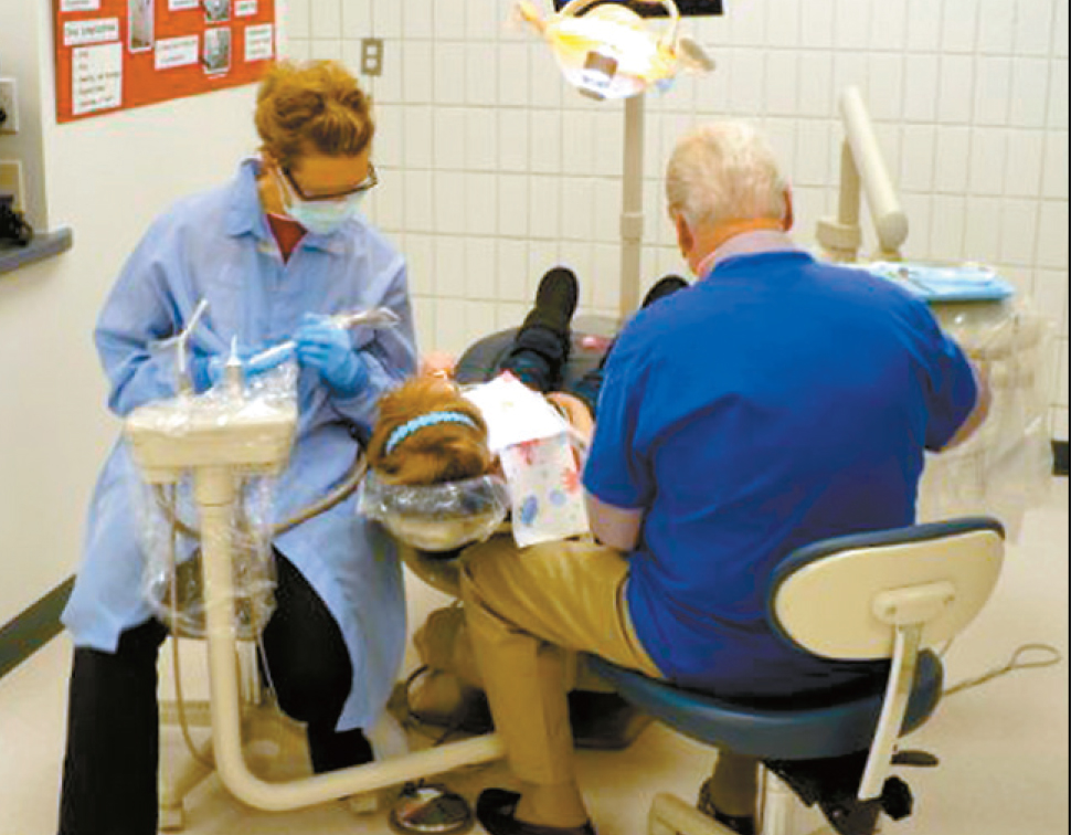 Dr. Larry Swenson, of Manson, right, along with Nikki Hall, second year dental hygiene student and one of the coordinators of the GKAS day community project, work on a young patient recently. Swenson, Dr. John Clay, of Fort Dodge and 12 Iowa Central students, were able to provide more than $2,500 worth of dental care for 16 area children ages 4 to 16 years old through the national Give Kids a Smile program.