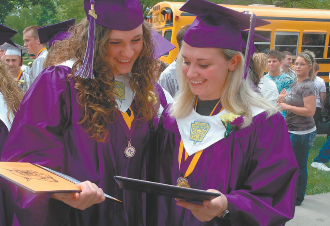 Angela Dunlay and Jennifer Van Diest check out their diplomas following the Webster City High School Commencement ceremony held at Jefferson Gym, Webster City.