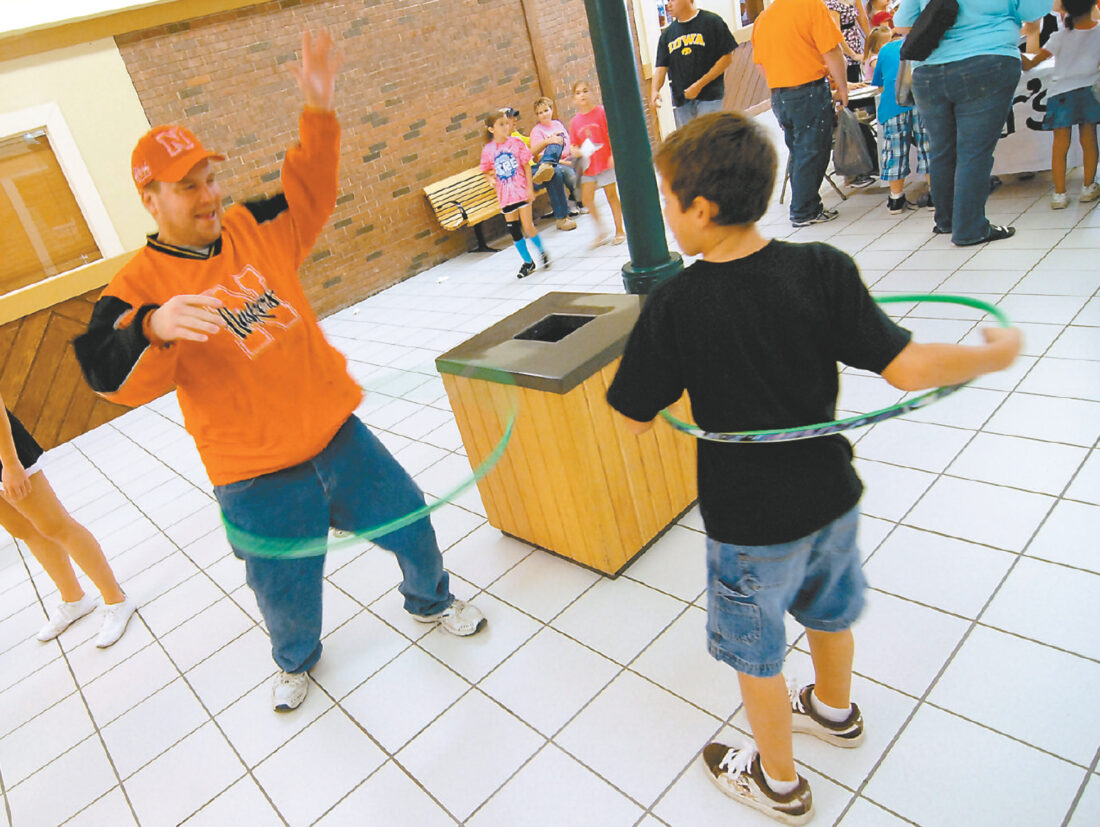 Ron Huffman, of Fort Dodge, tries his best to twirl along with his nephew Seth Ramirez, then 8, during the annual Hy-Vee Community Kids Fest at the Crossroads Mall.