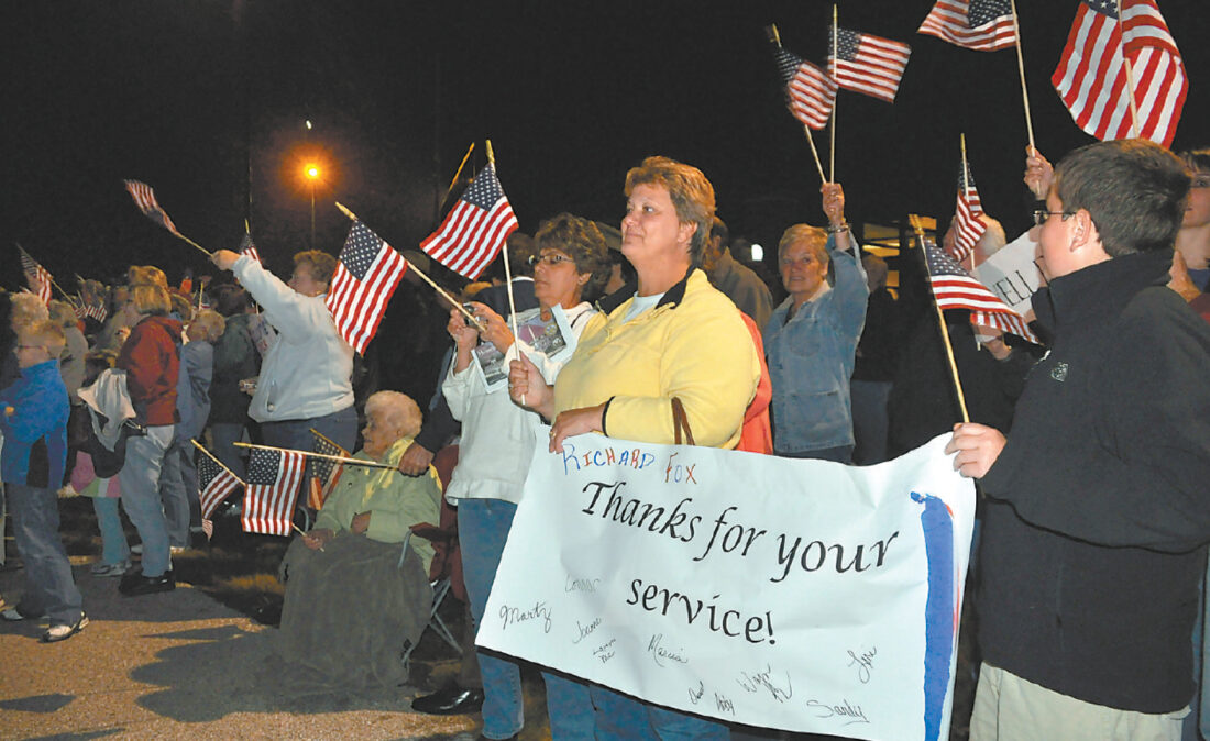 Greeters at the Fort Dodge Regional Airport had just caught sight of the first World War II veterans getting off the Honor Flight plane, greeted by waving flags and cheers. Joanne Nealon, of West Des Moines, in yellow, and her son, Connor Nealon, then 12, hold a sign for her father, Richard Fox, of Algona, the first man off the plane, while her mother, Barbara, watches from her lawn chair in the background.