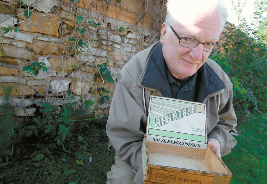 Fort Dodge historian Al Nelson kneels in front of what is left of the original Fort Dodge fort in the 300 block of Third Ave. N. He shows one of his many archive collection pieces — an old Wahkonsa cigar box from the 1900s.