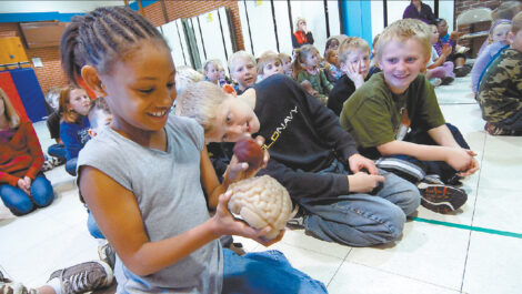 Hillcrest Elementary School third-grader Nyia Smith, left, examines a latex replica of an injured brain, and a replica injury pushing into it, during an I Got Caught safety program. Her classmates Kane Freeman, center, and Ty Porter, get a last glance at it after passing it to Smith.
