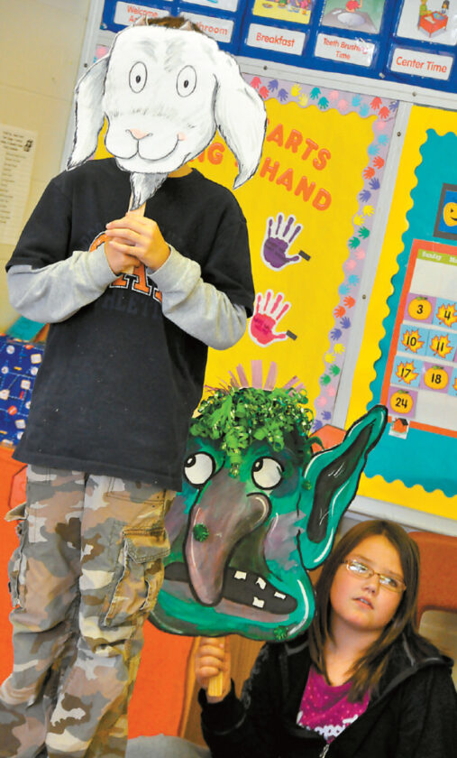 Elijah Litwiller, left, portraying the first billy goat, and Brienna Evans, right portraying the troll, act out a scene from the story, “The Three Billy Goats Gruff,” during a storytime at the Y.O.U.R Inc. Head Start 45th anniversary party. The day gave all Head Start families a chance to come together for games, prizes, educational information and stories to celebrate 45 years of the Head Start Program.