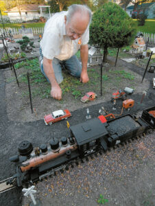 Richard Gustafson, of Dayton, pulls a few errant weeds from one of the yards on his backyard outdoor model railroad. By September 2010, Gustafson had spent about five years creating the various scenes on the layout.
