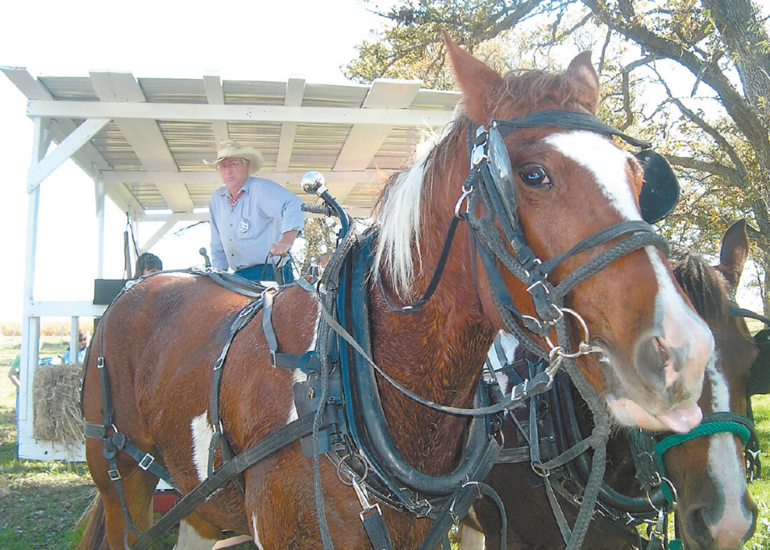 Prince Douglas and his harness mate, Queen Anne, pulled a hay rack with Jim Kellner, of Rutland, at the reins at the Pumpkins and Ponies fall festival at SpringVale Farm south of Humboldt. Visitors at the festival could ride the hay rack out to the pumpkin patch.