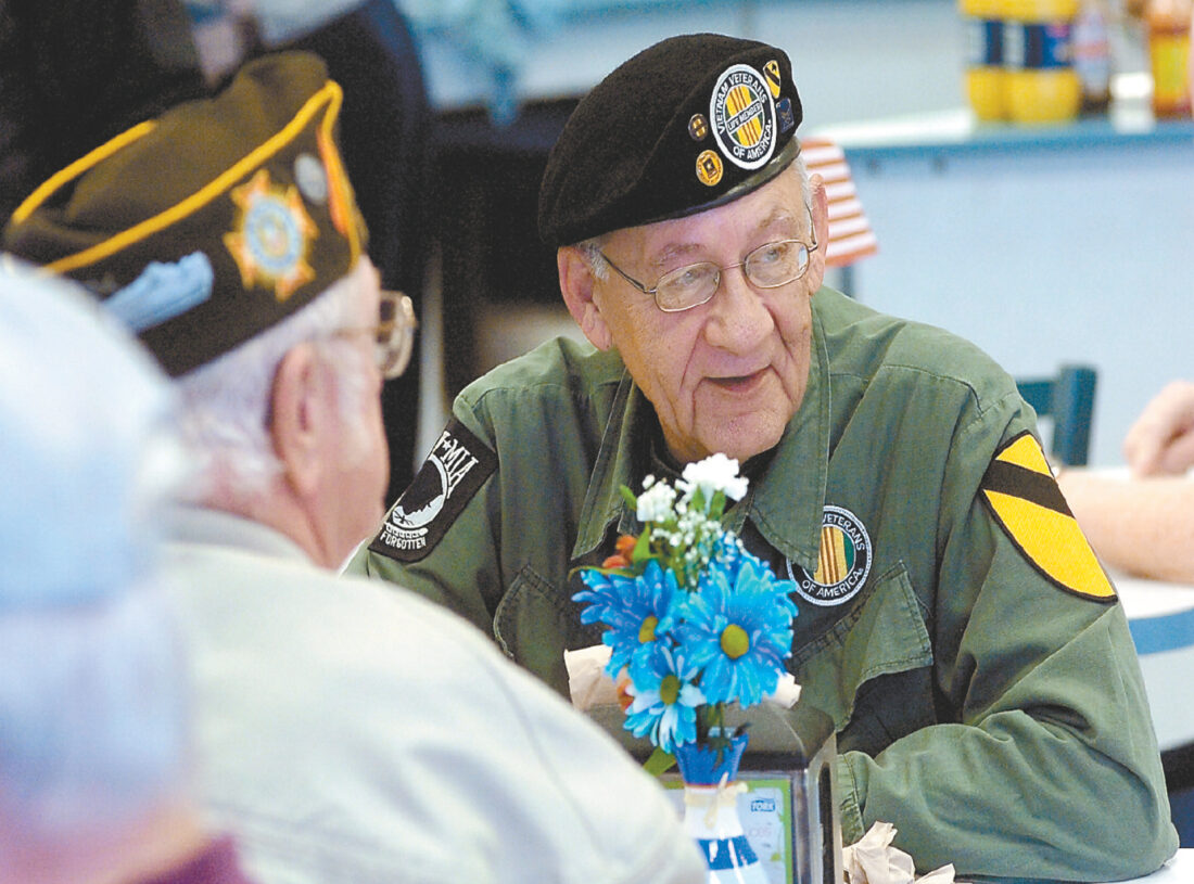 Steve Greene, of Fort Dodge, stops to chat with Bob Neumann, of Moorland, during a breakfast for veterans. Greene served in Vietnam, Neumann in World War II.