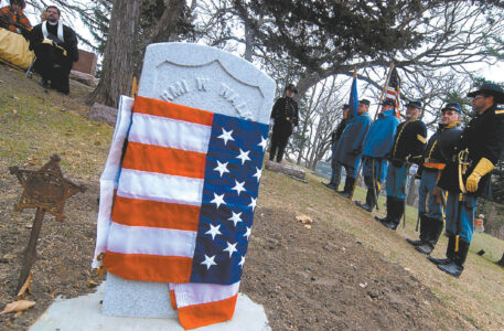A group of Civil War reenactors participate in a grave marker dedication in Oakland Cemetery. The flag around the grave marker of Civil War veteran Carmi Walker is an old tradition. During the ceremony, it is removed and properly folded. Walker and fellow Civil War veteran George Pierson had headstones, but they were badly deteriorated. Fort Dodge historian Jerry Rowe, who had previously obtained government headstones for 12 other Civil War veterans buried at Oakland Cemetery, secured replacement markers for Pierson and Walker.