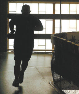 Brad Thiele, of Fort Dodge, one of the applicants for a position with the Webster County Sheriff’s Department, works on the running portion of the physical agility portion of the Civil Service Exam on the elevated running track at the Fort Dodge Community Recreation Center.