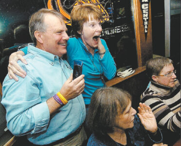 State Sen. Daryl Beall, D-Fort Dodge, celebrates his re-election victory with supporter Adrienne Smith, of Jefferson, at a gathering at Third Base in Fort Dodge. He would be serving his third term as state senator in Senate District 25.