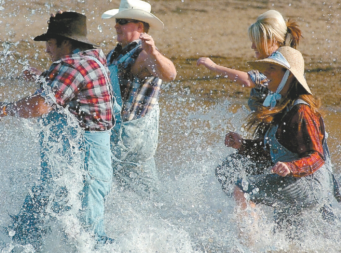 Members of the Webster County Sheriff’s Department team, The Chicken Little Posse, plunge into the waters of Badger Lake during the Special Olympics Polar Plunge. They include Detective Jason Bahr, center, and Deputy April Murray, right, along with Dalton Mcluckie, left, and Angalea Knowler, who were helping out the team.