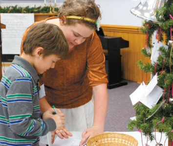 Jenna Schort, then 13, of Webster City, helps Dylan McCoskey, then 9, write the name of a family friend who died of cancer onto a piece of paper to hang on a Christmas tree. McCoskey’s freewill donation would go to the American Cancer Society. The article highlighted alternative Christmas gifts that help charities.